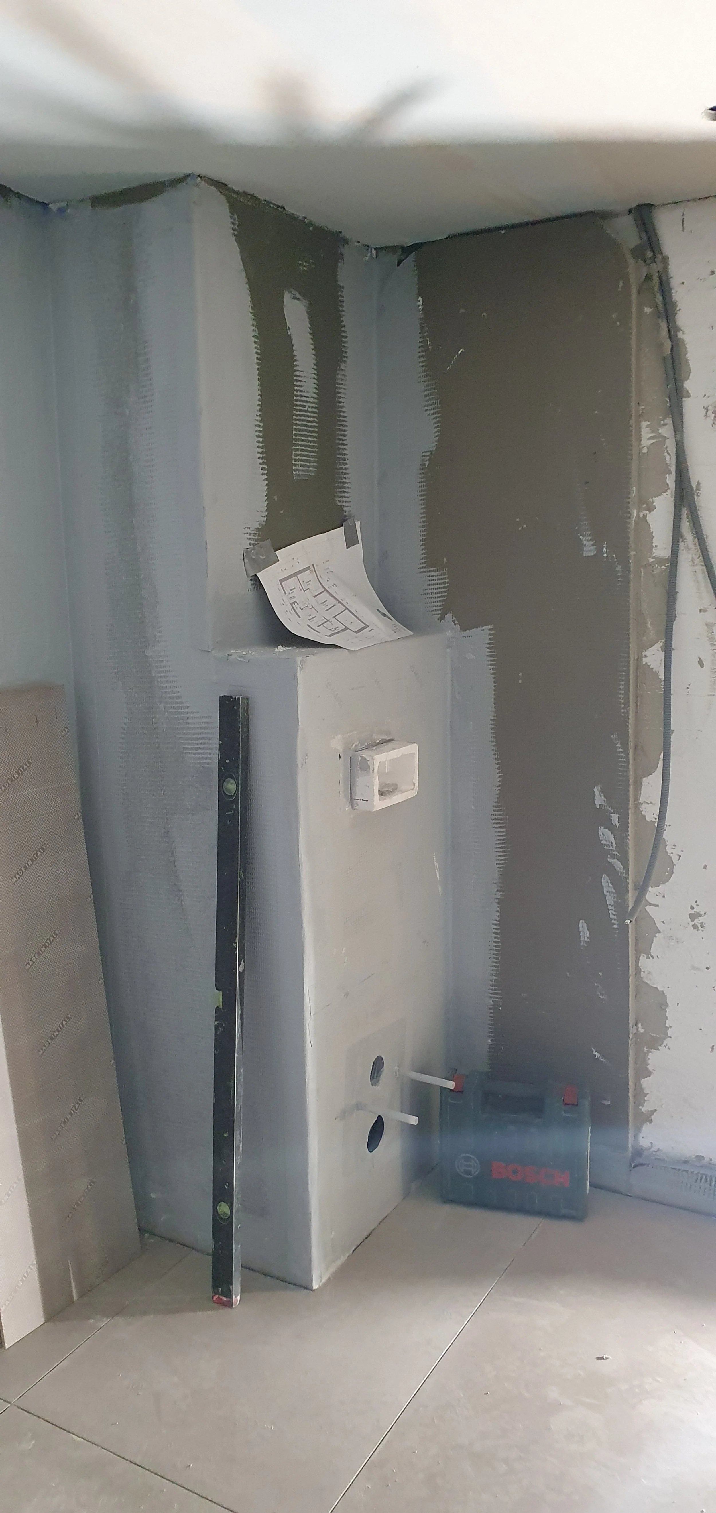 Oppussing av 2. etasjes hus i Langerudsvingen 21. Bildene er fra under oppføringen. Plantegninger/ Arbeidsstenginger og oppriss av boenhet: baderom, kjøkken, inngangsparti og oppholdsrom og soverom. med materialbeskrivelse.